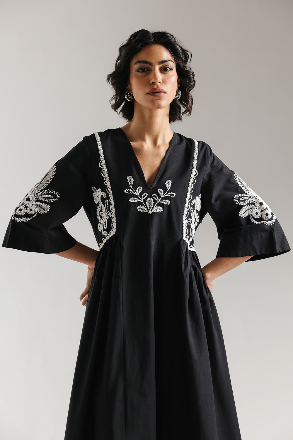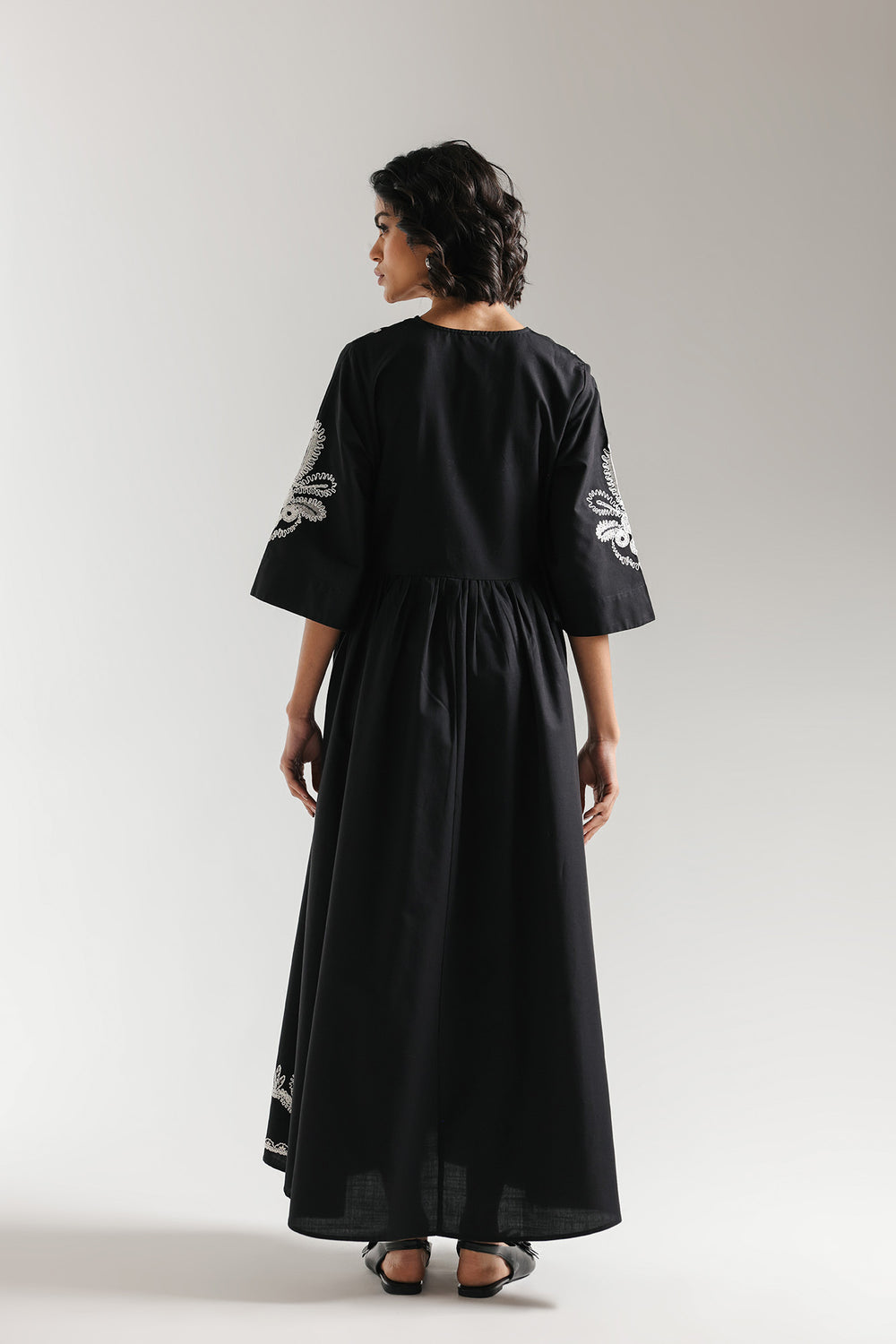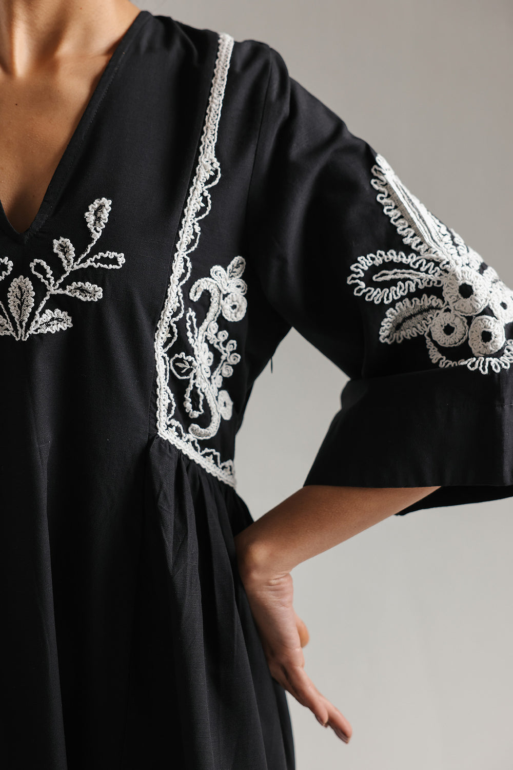 This elegant black maxi dress serves as a masterclass in monochrome sophistication, blending a classic silhouette with artisanal flair. The deep ebony fabric provides a dramatic canvas for the striking ivory embroidery that adorns the V-neckline, bodice, and sleeves in delicate floral and botanical motifs. A wide, ornate embroidered border circles the hem, adding a sense of weight and luxury to the flowing skirt.