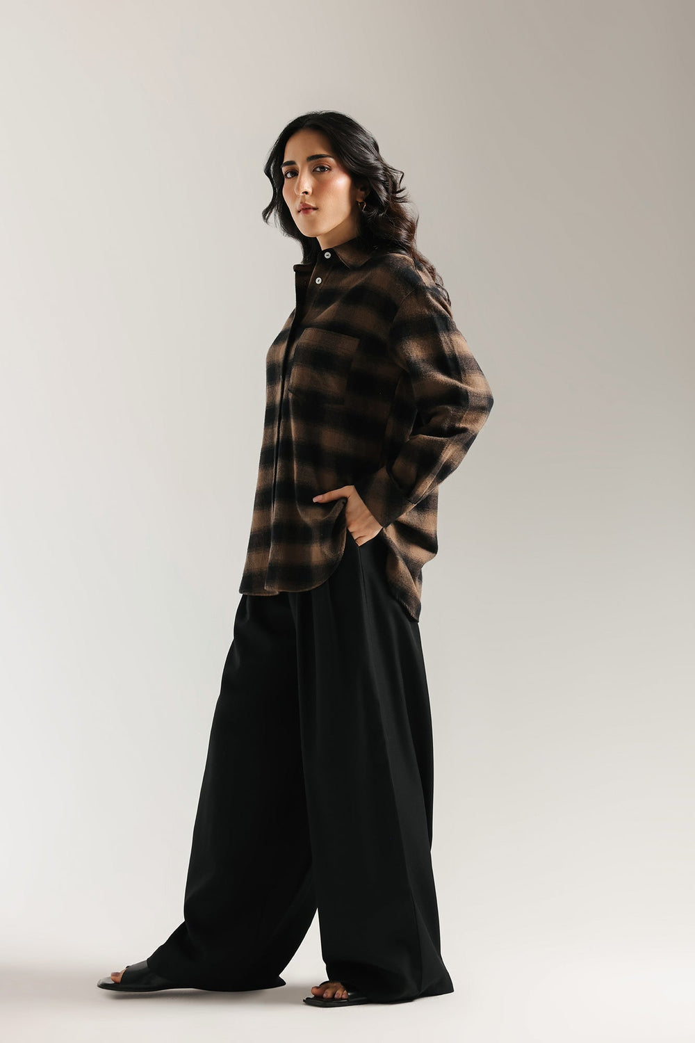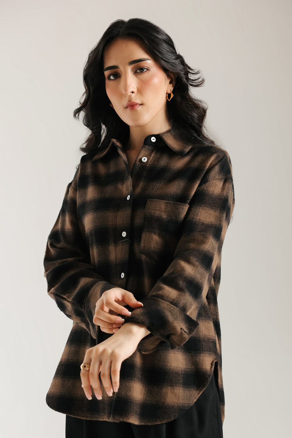 Experience the classic comfort of this plaid shirt. The shirt features a relaxed, oversized fit with a timeless brown and black plaid pattern. It has a classic collar, a button-up front, and long sleeves with buttoned cuffs. This versatile piece is perfect for layering or wearing on its own for a casual yet stylish look.