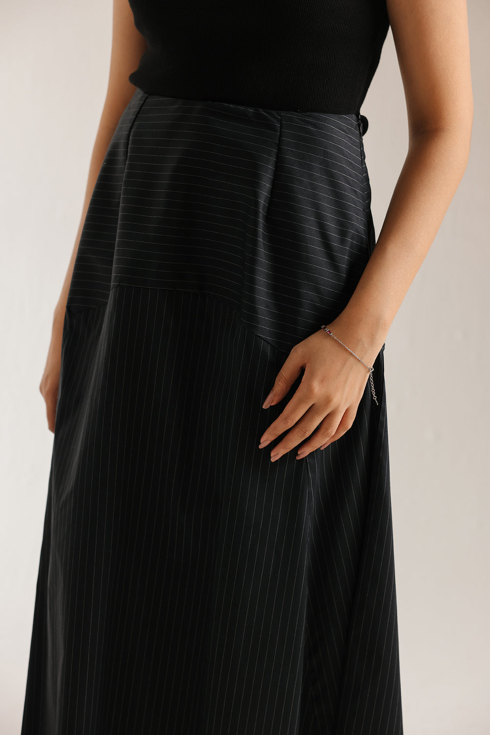 This sophisticated black skirt embodies refined elegance through meticulously considered design. The classic A-line silhouette flatters effortlessly, while delicate pleats details add intricate visual interest. Featuring a trendy pin stripe pattern throughout, the flowing length of the skirt moves gracefully with every step, making it ideal for evening occasions. A masterful blend of timeless silhouette and contemporary design, this skirt appeals to discerning individuals who value both sophistication and distinctive style.