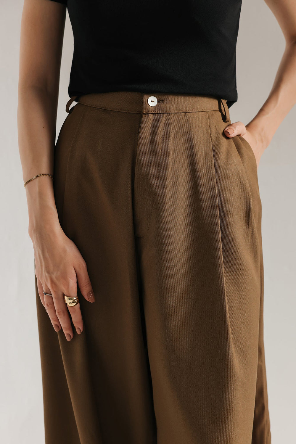 Elevate your wardrobe with these sophisticated and stylish trousers. The rich, earthy brown hue and pleated design create an elegant and flattering high-waisted fit. With their graceful wide-leg cut and relaxed drape, these trousers offer a modern and polished look that combines comfort with timeless style, making them a versatile piece for any occasion.