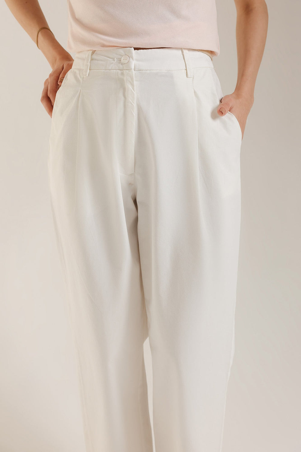 Elevate your everyday style with these sophisticated white trousers, designed for both comfort and a polished look. Featuring a flattering straight fit silhouette and elegant pleating at the waist, they offer a relaxed yet refined drape. Crafted from a soft and versatile fabric, these trousers are perfect for pairing with a variety of tops, making them an essential addition to your wardrobe for any casual or smart-casual occasion.